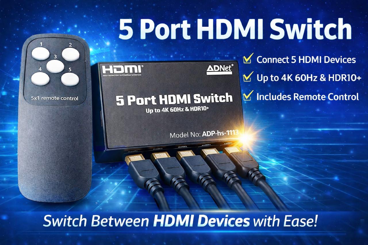 he ADNet 5-in-1 HDMI Switch (Model: ADP-HS-1113) is a high-performance video switcher designed to connect up to three HDMI source devicesāsuch as gaming consoles (PS5/Xbox), set-top boxes, and laptopsāto a single HDMI display (TV, Monitor, or Projector).