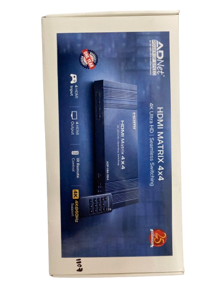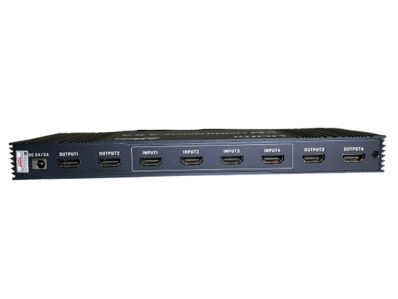 The ADP-HM-1104 is a high-performance 4×4 HDMI Matrix Switcher designed for professional and home entertainment AV setups. It allows you to route two different HDMI sources (like a gaming console and a Blu-ray player) to two different HDMI displays (like a TV and a projector) simultaneously and independently.