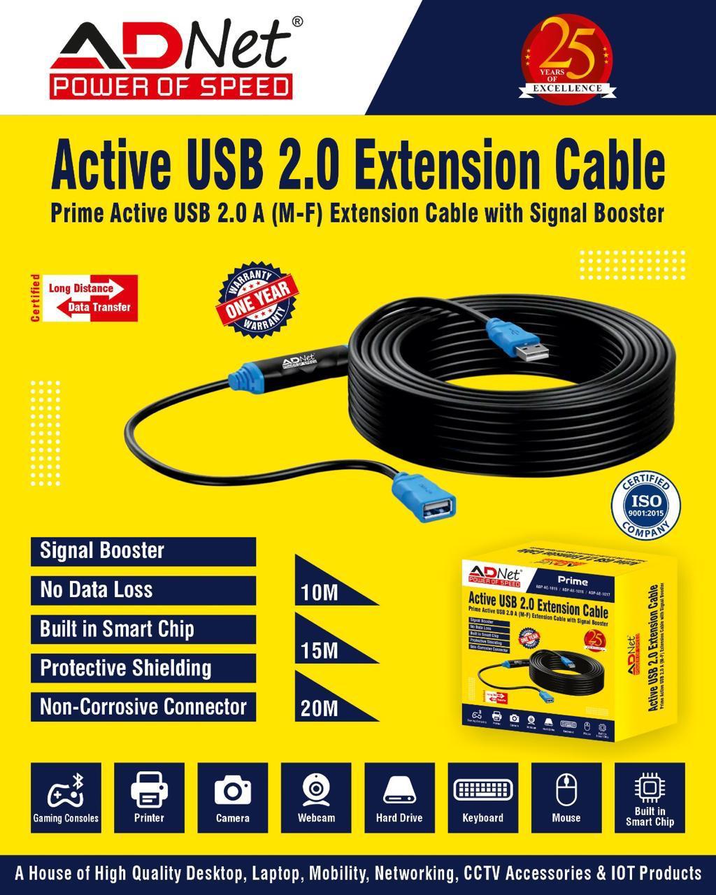 USB 2.0 Active Extension Cable 10 m USB Male to Female ADP-AE-1015